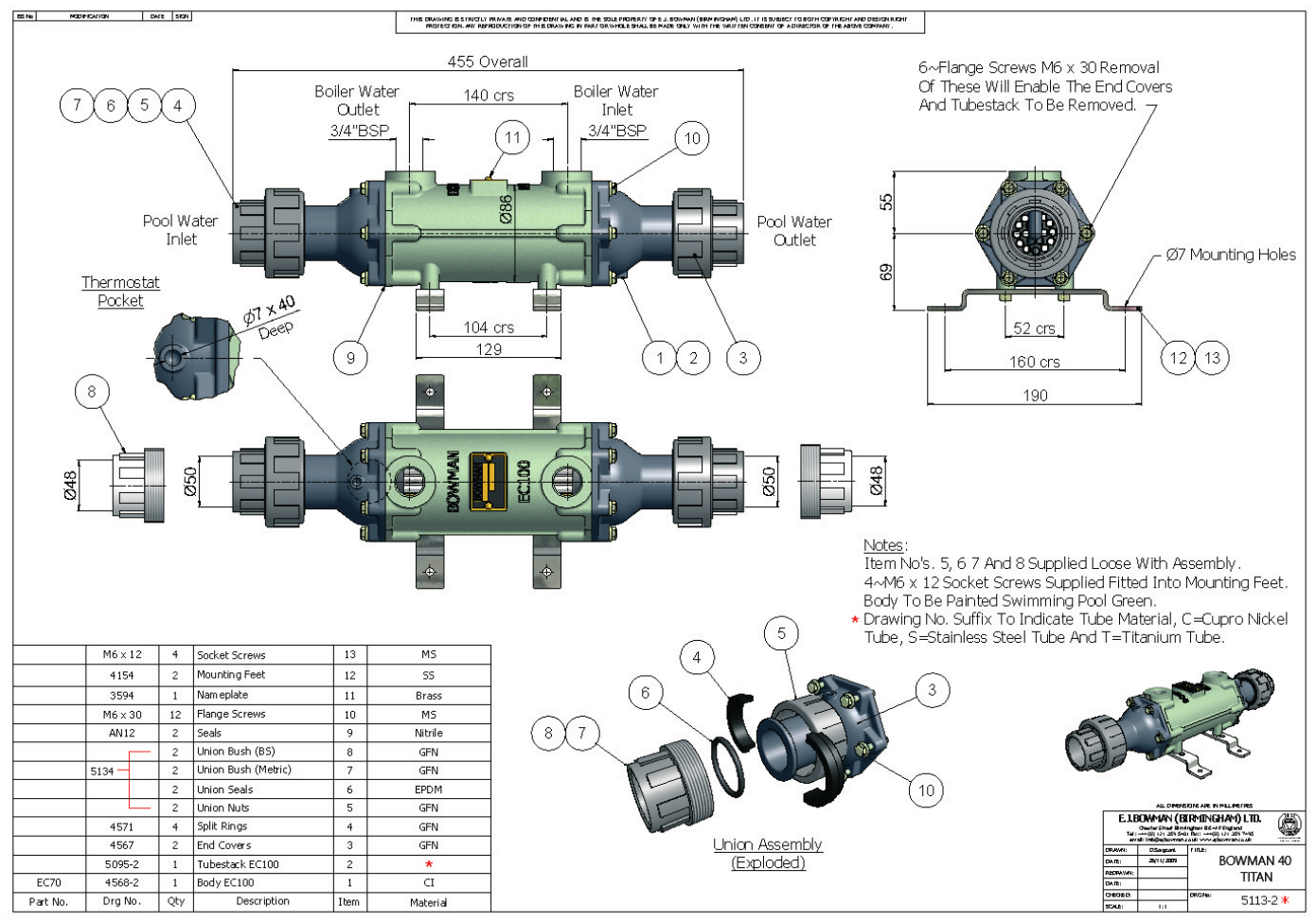 Wärmetauscher aus Titan für die SchwimmbadwassererwärmungDer Wärmetauscher überträgt eine Leistung von 40 kW bei einer Heizungswasser-Temperatur von 80°C.